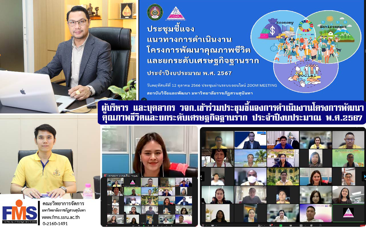 วันที่ 12 ตุลาคม 2566 เวลา 14.00 น. ผู้ช่วยศาสตราจารย์ ดร.สมศักดิ์ คล้ายสังข์ คณบดีคณะวิทยาการจัดการ พร้อมด้วยผู้ช่วยศาสตราจารย์ ดร. ณัฐพงษ์ เตชะรัตนเสฏฐ์ รองคณบดีฝ่ายวิจัยและบริการวิชาการ และบุคลากรฝ่ายพัฒนางานวิจัยและบริการวิชาการ เข้าร่วมประชุมชี้แจงการดำเนินงานโครงการพัฒนาคุณภาพชีวิต และยกระดับเศรษฐกิจฐานราก ประจำปีงบประมาณ พ.ศ.2567 โดยมีผู้ช่วยศาสตราจารย์ ดร.วัฒน์ พลอยศรี รองผู้อำนวยการฝ่ายบริการวิชาการ สถาบันวิจัยและพัฒนา เป็นประธานการประชุม ในรูปแบบการประชุมออนไลน์ผ่านโปรแกรม Zoom Meeting