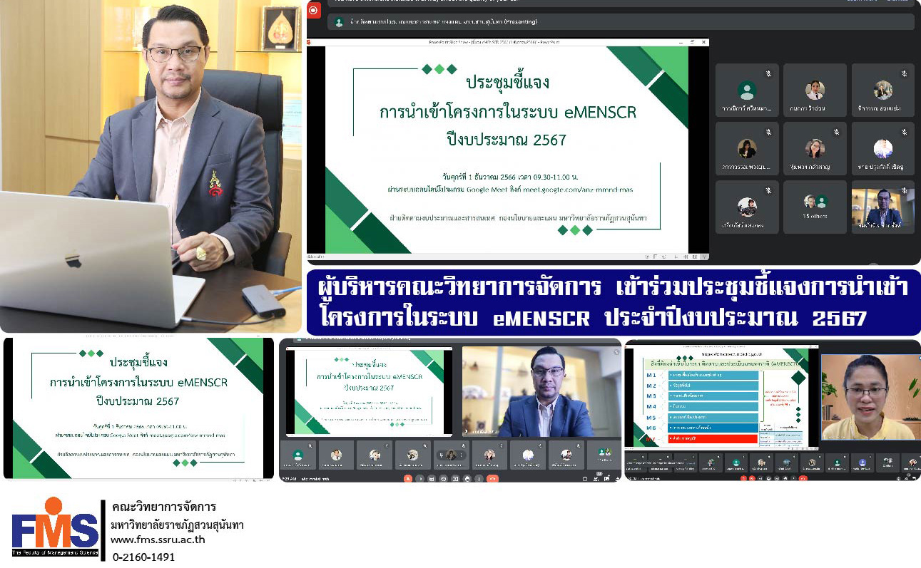 วันที่ 1 ธันวาคม 2566 เวลา 09.30 น. ผู้ช่วยศาตราจารย์ ดร.สมศักดิ์ คล้ายสังข์ คณบดีคณะวิทยาการจัดการ เข้าร่วมประชุมชี้แจงการนำเข้าโครงการในระบบ eMENSCR ประจำปีงบประมาณ 2567 จัดโดยกองนโยบายและแผน เพื่อให้บุคลากรผู้ปฏิบัติงานมีความเข้าใจในการปฏิบัติเป็นไปในทิศทางเดียวกัน มีผู้บริหาร บุคลาการที่เกี่ยวข้อง เข้าร่วมประชุมผ่านระบบออนไลน์โปรแกรม Google Meet