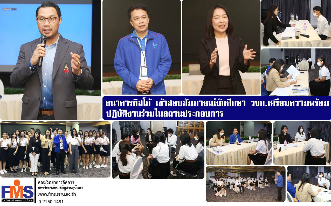 วันที่ 7 ธันวาคม 2566 คณะวิทยาการจัดการ มหาวิทยาลัยราชภัฏสวนสุนันทา ดำเนินแนวทางการปฏิบัติงานร่วมในสถานประกอบการ แก่นักศึกษา ตามนโยบายและทิศทางของมหาวิทยาลัยในด้านการเรียนการสอนที่มุ่งเน้นการสร้างความเป็นมืออาชีพ ผ่านการเรียนการสอนภายใต้สถานการณ์จริง โดยทีมงานผู้แทนจากธนาคารทิสโก้ จำกัด (มหาชน) ได้เปิดรับสมัครนักศึกษาที่สนใจ ปฏิบัติงานร่วมกับกลุ่มธนาคารทิสโก้ จำกัด (มหาชน) ได้แก่ นักศึกษาแขนงวิชาการเงินการธนาคาร แขนงวิชาการตลาด คณะวิทยาการจัดการ ซึ่งให้ความสนใจเข้าร่วมสมัครเป็นจำนวนมาก