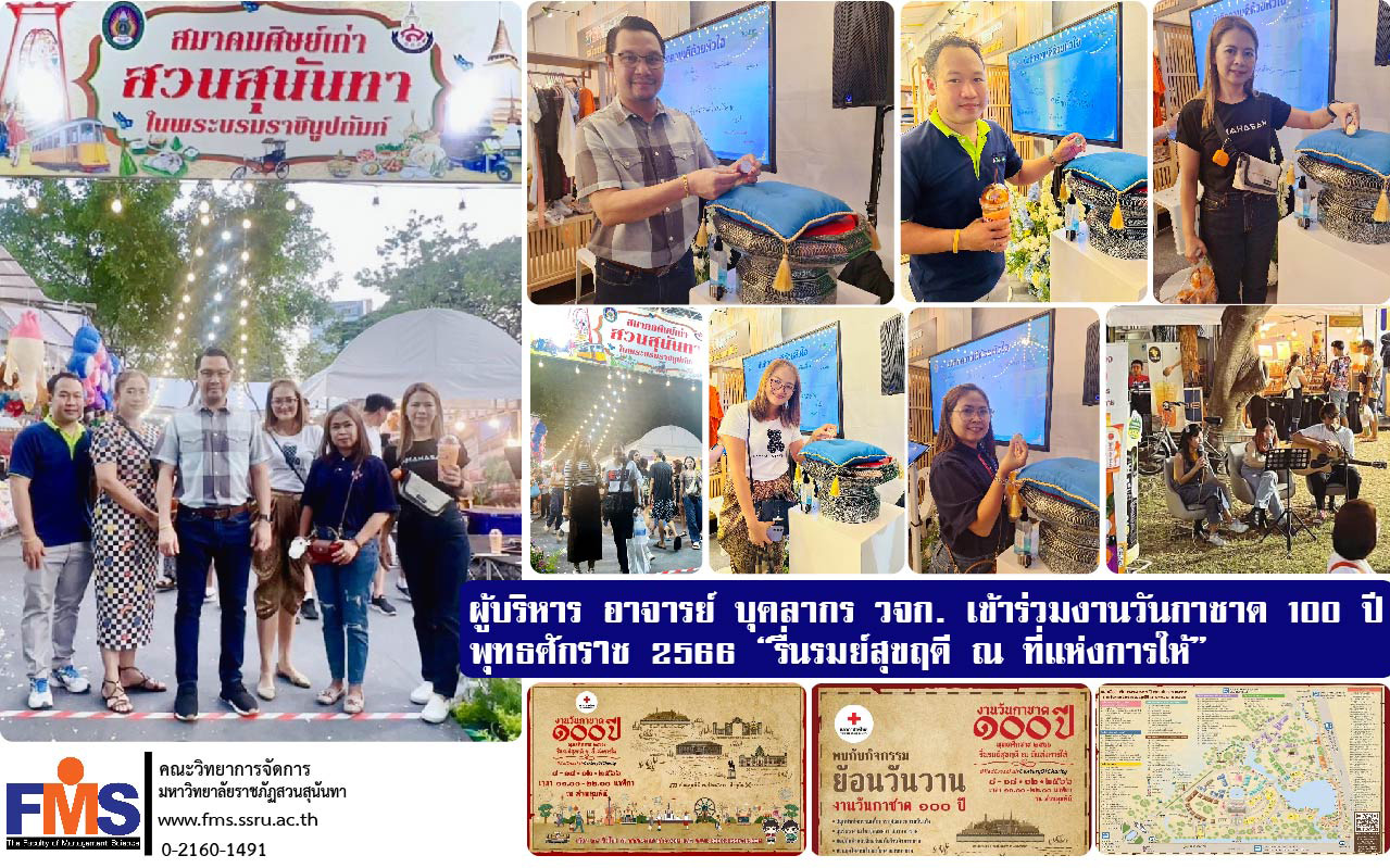 วันที่ 11 ธันวาคม 2566 คณะวิทยาการจัดการ มหาวิทยาลัยราชภัฏสวนสุนันทา นำโดย ผู้ช่วยศาตราจารย์ ดร.สมศักดิ์ คล้ายสังข์ คณบดีคณะวิทยาการจัดการ พร้อมด้วยอาจารย์และบุคลากรสายสนับสนุนวิชาการประจำคณะ เข้าร่วมงานวันกาชาด 100 ปี พุทธศักราช 2566 “รื่นรมย์สุขฤดี ณ ที่แห่งการให้” พร้อมเยี่ยมชมบูธจำหน่ายสินค้า อาหาร เครื่องดื่ม จัดโดยสำนักทรัพย์สินและรายได้ และเข้าร่วมกิจกรรมตามบูธหน่วยงานต่างๆ นอกจากนี้ผู้แทนนักศึกษาจากสโมสรนักศึกษาคณะวิทยาการจัดการ ได้ร่วมแสดงดนตรีสร้างสีสันความบันเทิงและบรรยากาศแห่งความสุขภายในงานอีกด้วย
