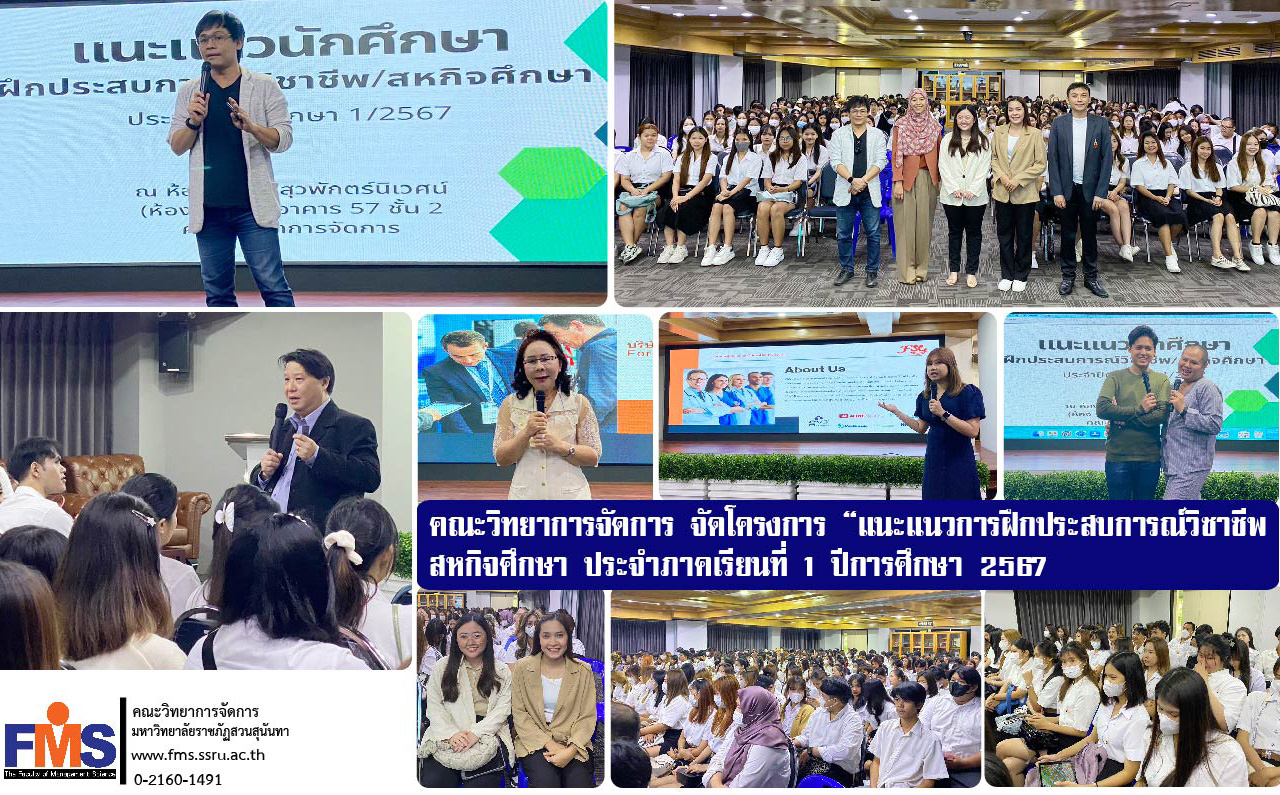 เมื่อวันที่ 16-17 ธันวาคม 2566 ที่ผ่านมา คณะวิทยาการจัดการ มหาวิทยาลัยราชภัฏสวนสุนันทา จัดโครงการ “แนะแนวการฝึกประสบการณ์วิชาชีพ/สหกิจศึกษา ประจำภาคเรียนที่ 1 ปีการศึกษา 2567 โดยมีอาจารย์ ดร.กฤษณะ เชื้อชัยนาท รองคณบดีฝ่ายวิชาการ เป็นประธานกล่าวเปิดโครงการพร้อมให้โอวาทแก่นักศึกษา ร่วมด้วยอาจารย์ ดร.หุดา วงษ์ยิ้ม หัวหน้าสาขาวิชาการบัญชี และอาจารย์ ดร.ขวัญฉัตร วงศ์จันทร์ทิพย์ อาจารย์ประจำสาขาวิชาการบัญชี เข้าร่วมเป็นเกียรติในโครงการดังกล่าว