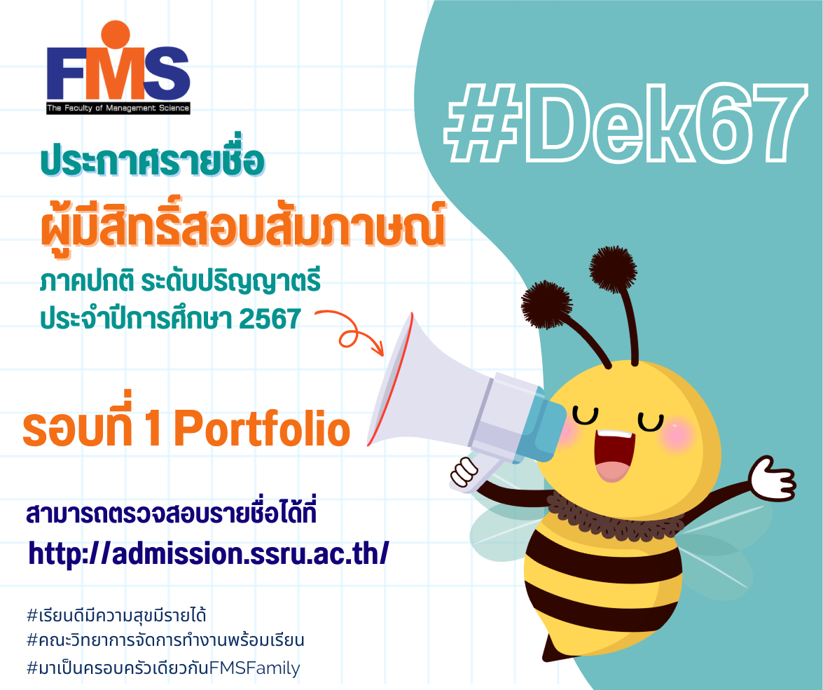 มหาวิทยาลัยราชภัฏสวนสุนันทา ประกาศรายชื่อผู้มีสิทธิ์สอบสัมภาษณ์ ภาคปกติ ระดับปริญญาตรี ประจำปีการศึกษา 2567 (รอบที่ 1 Portfolio) ผู้สมัครสามารถตรวจสอบได้ที่เว็บไซต์ https://admission.ssru.ac.th/login