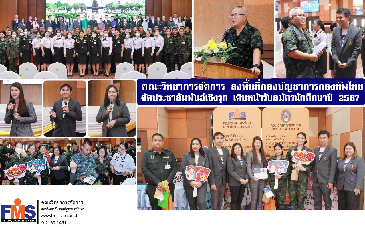 วันที่ 16 มกราคม 2567 คณะวิทยาการจัดการ มหาวิทยาลัยราชภัฏสวนสุนันทา นำโดย อาจารย์ ดร.ปิติมนัส บรรลือ รองคณบดีฝ่ายบริหาร พร้อมด้วยผู้ช่วยศาสตราจารย์.ดร.ณัฐชาฎ์ ผาสุข อาจารย์ประจำแขนงวิชาการเงินการธนาคาร อาจารย์ ดร.ขวัญฉัตร วงศ์จันทร์ทิพย์ อาจารย์ประจำสาขาวิชาการบัญชี อาจารย์ จีรพรรณ์ จันทร์วิเชียร อาจารย์ประจำแขนงวิชาวิชาบริหารทรัพยากรมนุษย์ และทีมบุคลากร ลงพื้นที่กองบัญชาการกองทัพไทย ดำเนินโครงการประชาสัมพันธ์เชิงรุก ตามนโยบายการมุ่งเน้นการประชาสัมพันธ์เชิงรุกของผู้ช่วยศาสตราจารย์ ดร.สมศักดิ์ คล้ายสังข์ คณบดีคณะวิทยาการจัดการ ในประชาสัมพันธ์ข้อมูล แนะแนวการศึกษาต่อ ในคณะวิทยาการจัดการ มหาวิทยาลัยราชภัฏสวนสุนันทา เพื่อเตรียมความพร้อมการรับสมัครนักศึกษาใหม่ ประจำปี 2567 ในโอกาสนี้ได้รับเกียรติจาก พล.ต. สัมพันธ์ รงศ์จำเริญ รองเจ้ากรมกำลังพลทหาร กองบัญชาการกองทัพไทย เป็นประธานในพิธีเปิดพร้อมกล่าวต้อนรับ และเข้าเยี่ยมชมบูธของคณะวิทยาการจัดการ มีกำลังพลของส่วนราชการ สังกัดกองบัญชาการกองทัพไทย เข้าร่วมรับฟังข้อมูล ซึ่งต่างให้ความสนใจในหลักสูตรการเรียนการสอนของคณะวิทยาการจัดการเป็นอย่างยิ่ง จัดขึ้น ณ สโมสรกองบัญชาการกองทัพไทย กรุงเทพมหานคร