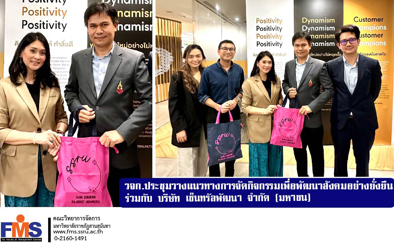 เมื่อวันที่ 31 มกราคม 2567 ที่ผ่านมา ณ ห้องประชุมลาดพร้าว บริษัท เซ็นทรัลพัฒนา จำกัด (มหาชน) คณะวิทยาการจัดการ มหาวิทยาลัยราชภัฏสวนสุนันทา โดยอาจารย์ ดร. ปิติมนัส บรรลือ รองคณบดีฝ่ายบริหาร ประชุมแผนความร่วมมือและแนวทางการจัดกิจกรรมเพื่อพัฒนาสังคมอย่างยั่งยืน ร่วมกับผู้บริหารและคณะผู้ดำเนินงาน บริษัท เซ็นทรัลพัฒนา จำกัด (มหาชน) โดยมี นางสาวเกสราภรณ์ สุขแก้ว ผู้จัดการฝ่ายบริหารความเป็นเลิศและการพัฒนาที่ยั่งยืน บริษัท เซ็นทรัลพัฒนา จำกัด (มหาชน) ประชุมหารือร่วมกับคณะวิทยาการจัดการ พร้อมกำหนดแนวทางการจัดกิจกรรมเพื่อนักศึกษาและเยาวชนร่วมกันสู่เป้าหมายการพัฒนาที่ยั่งยืน (Sustainable Development Goals: SDGs) ยกระดับสู่มาตรฐานความยั่งยืนระดับโลก (Dow Jones Sustainability Indices) ผลักดันวิสัยทัศน์ใหม่ของมหาวิทยาลัยราชภัฏสวนสุนันทา” ผู้นำการสร้างมืออาชีพเพื่อพัฒนาสังคมอย่างยั่งยืน“ สู่การปฏิบัติอย่างเป็นรูปธรรม