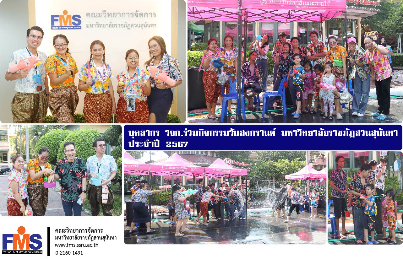 บรรยากาศกิจกรรมวันสงกรานต์ มหาวิทยาลัยราชภัฏสวนสุนันทา ประจำปี 2567 เมื่อวันที่ 4 เมษายน 2567 ผู้บริหาร อาจารย์ บุคลากร และนักศึกษาคณะวิทยาการจัดการ มหาวิทยาลัยราชภัฏสวนสุนันทา ร่วมกิจกรรมวันสงกรานต์ ประจำปี 2567 เล่นน้ำ คลายร้อน บรรยากาศเป็นไปอย่างคึกคัก บุคลากรแต่ละหน่วยงาน เล่นอุโมงค์น้ำ สาดน้ำกันอย่างชุ่มฉ่ำ อบอวลไปด้วยรอยยิ้ม และเสียงหัวเราะ ณ จุดเล่นน้ำบริเวณเส้นหลักภายในมหาวิทยาลัย