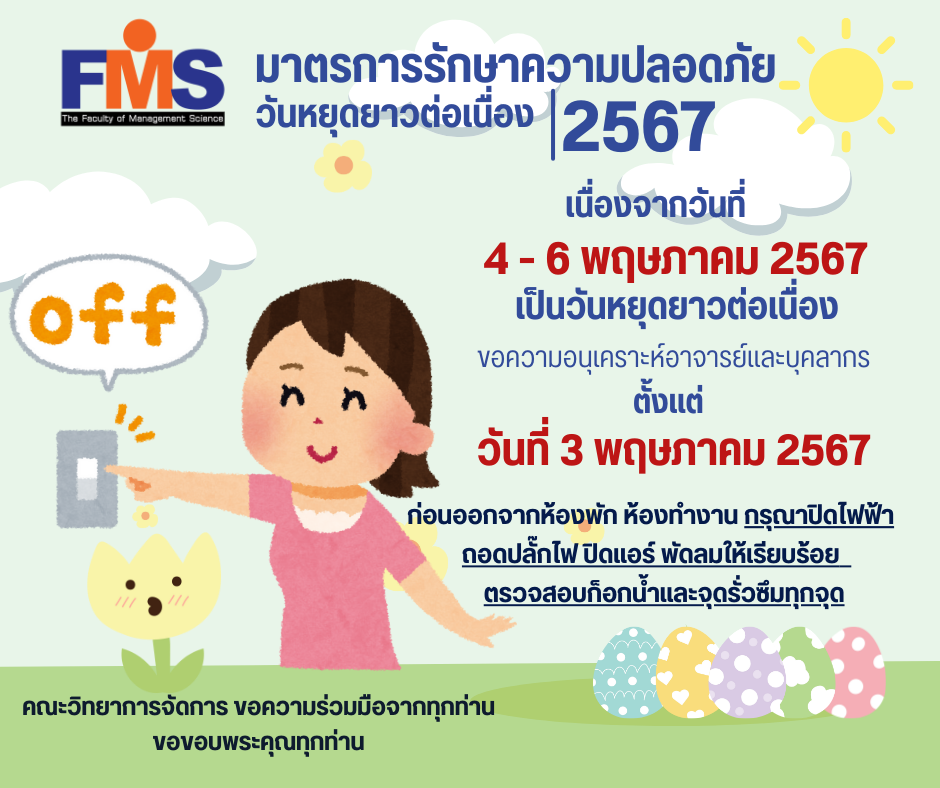 ขอความอนุเคราะห์อาจารย์และบุคลากร ก่อนออกจากห้องพัก ห้องทำงาน กรุณาปิดไฟฟ้า ถอดปลั๊กไฟ ปิดแอร์ พัดลมให้เรียบร้อย ตรวจสอบก็อกน้ำและจุดรั่วซึมทุกจุด