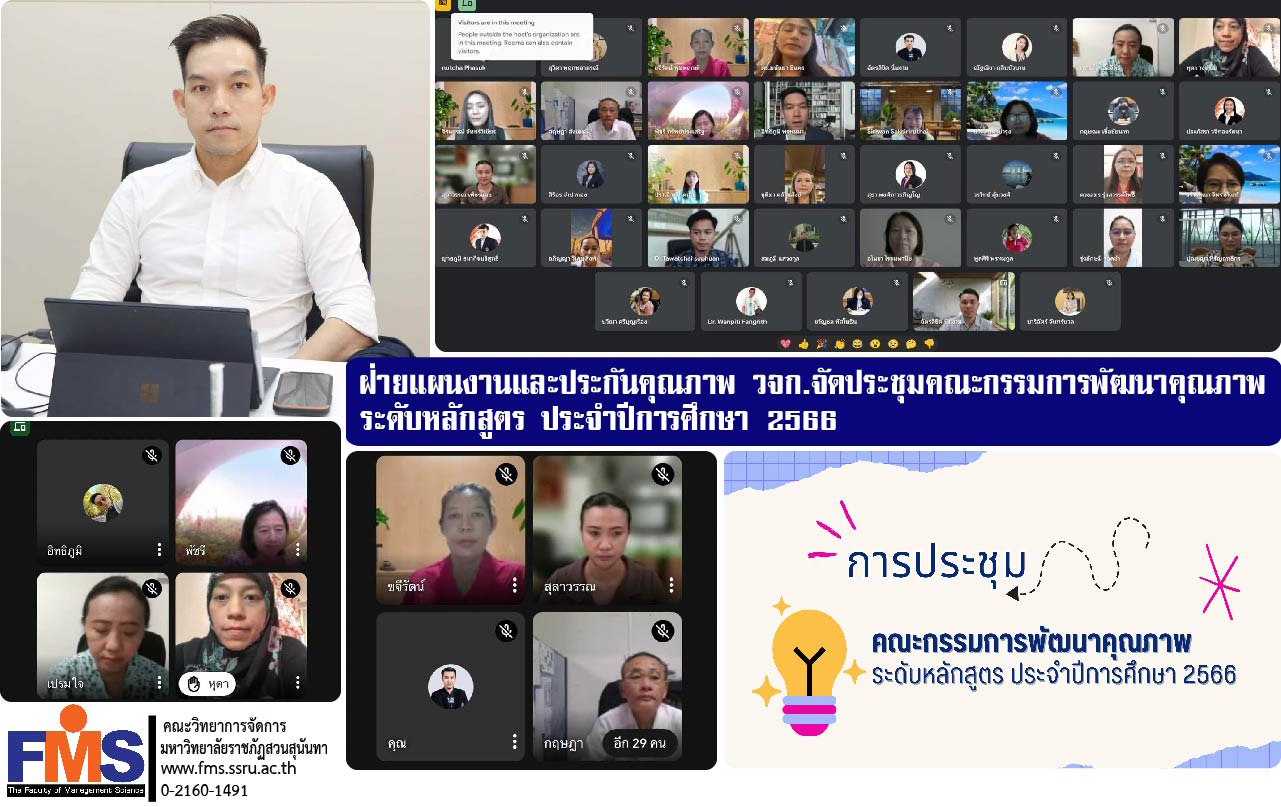 วันที่ 14 พฤษภาคม 2567 ฝ่ายแผนงานและประกันคุณภาพ คณะวิทยาการจัดการ จัดประชุมคณะกรรมการพัฒนาคุณภาพ ระดับหลักสูตร ประจำปีการศึกษา 2566 โดยมีอาจารย์ ดร. อิทธิภูมิ พรหมมา รองคณบดีฝ่ายแผนงานและประกันคุณภาพ เป็นประธานการประชุม เพื่อแลกเปลี่ยนเรียนรู้กระบวนการปฏิบัติงาน ตลอดจนแนวทางในการดำเนินงานการประกันคุณภาพการศึกษา ระดับหลักสูตร ให้เป็นไปในทิศทางเดียวกันและบรรลุเป้าหมาย มีอาจารย์ประจำหลักสูตร และบุคลากรที่เกี่ยวข้อง เข้าร่วมประชุมทางระบบออนไลน์ด้วยโปรแกรม Google meet
