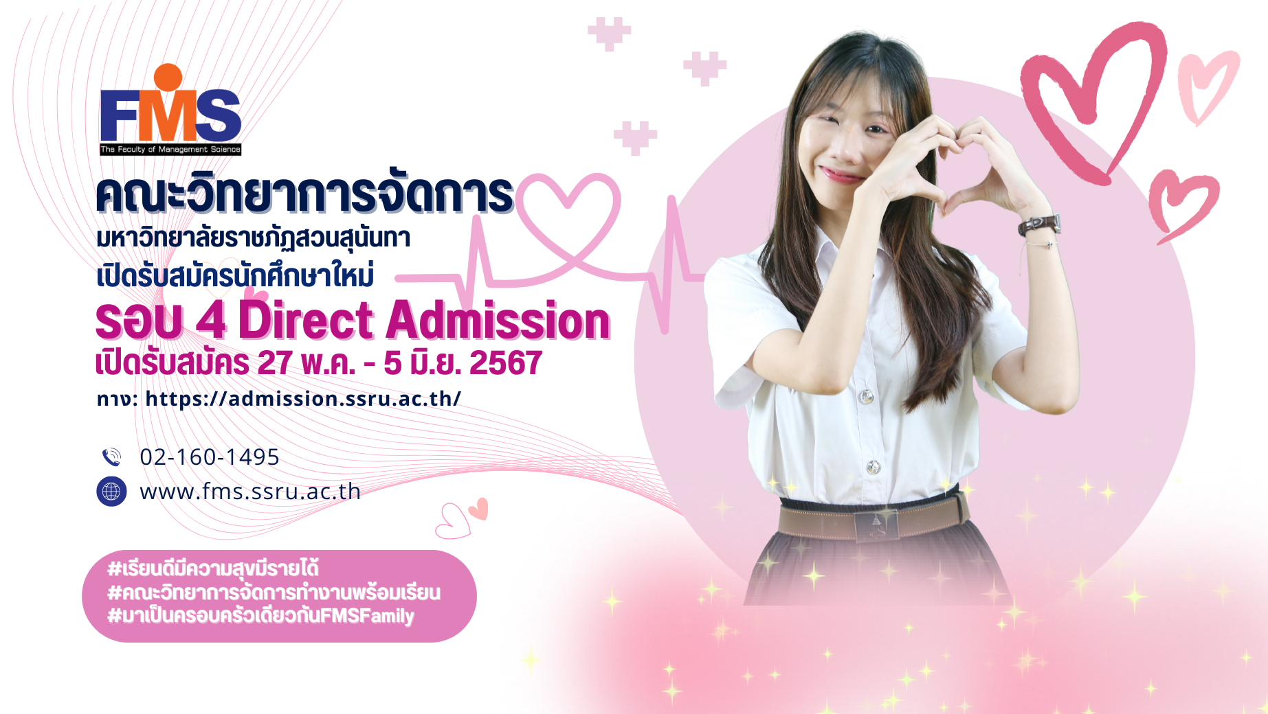 คณะวิทยาการจัดการ มหาวิทยาลัยราชภัฏสวนสุนันทา เปิดรับสมัครนักศึกษาใหม่ ภาคปกติ ระดับปริญญาตรี ประจำปีการศึกษา 2567 (รอบที่ 4 Direct Admission) ตั้งแต่วันที่ 27 พฤษภาคม - 5 มิถุนายน 2567