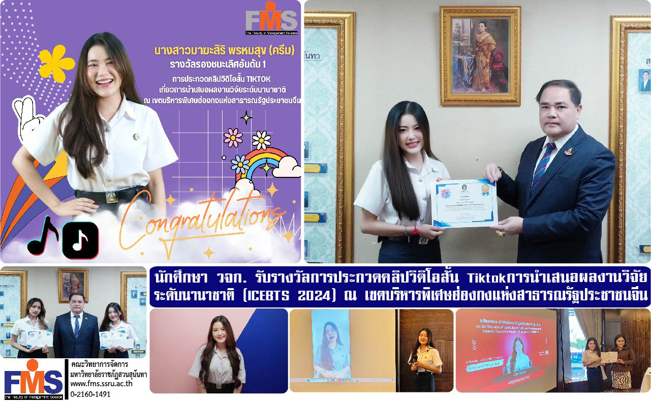 คณะวิทยาการจัดการ มหาวิทยาลัยราชภัฏสวนสุนันทา ขอแสดงความยินดีกับ นางสาวมาฆะสิริ พรหมสุข นักศึกษาแขนงวิชาธุรกิจระหว่างประเทศ ตัวแทนของคณะวิทยาการจัดการฯ ได้รับรางวัลรองชนะเลิศอันดับ 1การประกวดคลิปวิดิโอสั้น TIKTOK เกี่ยวการนำเสนอผลงานวิจัยระดับนานาชาติ ณ เขตบริหารพิเศษฮ่องกงแห่งสาธารณรัฐประชาชนจีน โดยผู้ช่วยศาสตราจารย์ ดร.กวิน วงศ์ลีดี ผู้อำนวยการสถาบันภาษา เป็นผู้มอบรางวัลดังกล่าว ณ สถาบันภาษา มหาวิทยาลัยราชภัฏสวนสุนันทา สำหรับผลงานของนักศึกษา ได้ผ่านการพิจารณาจากผู้บริหารมหาวิทยาลัยและสถาบันภาษา ซึ่งคัดเลือกจากวิดีโอที่มีความคิดสร้างสรรค์ มีความถูกต้องทางภาษาอังกฤษ และสามารถเป็นตัวอย่างที่ดีให้กับนักศึกษารุ่นต่อไปได้