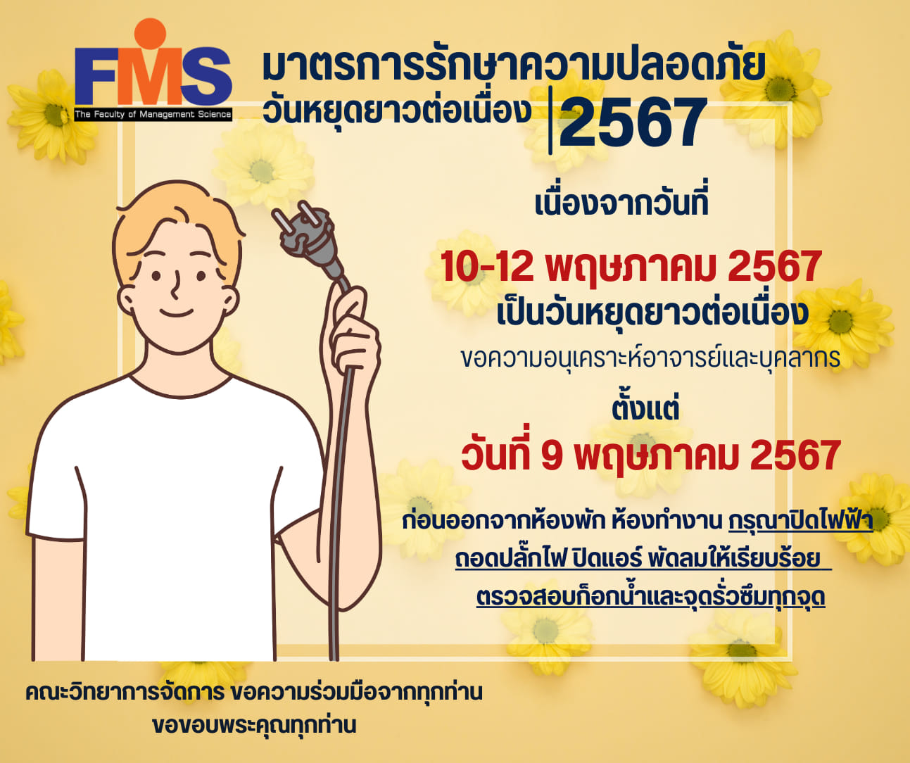 ขอความอนุเคราะห์อาจารย์และบุคลากร ก่อนออกจากห้องพัก ห้องทำงาน กรุณาปิดไฟฟ้า ถอดปลั๊กไฟ ปิดแอร์ พัดลมให้เรียบร้อย ตรวจสอบก็อกน้ำและจุดรั่วซึมทุกจุด