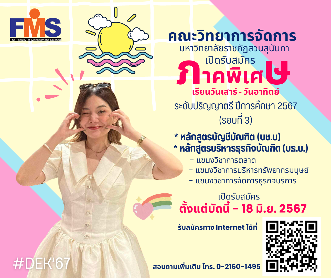 คณะวิทยาการจัดการ มหาวิทยาลัยราชภัฏสวนสุนันทา เปิดรับสมัครนักศึกษาใหม่ ภาคปกติ ระดับปริญญาตรี ประจำปีการศึกษา 2567 (รอบที่ 4 Direct Admission) ตั้งแต่วันที่ 27 พฤษภาคม - 5 มิถุนายน 2567