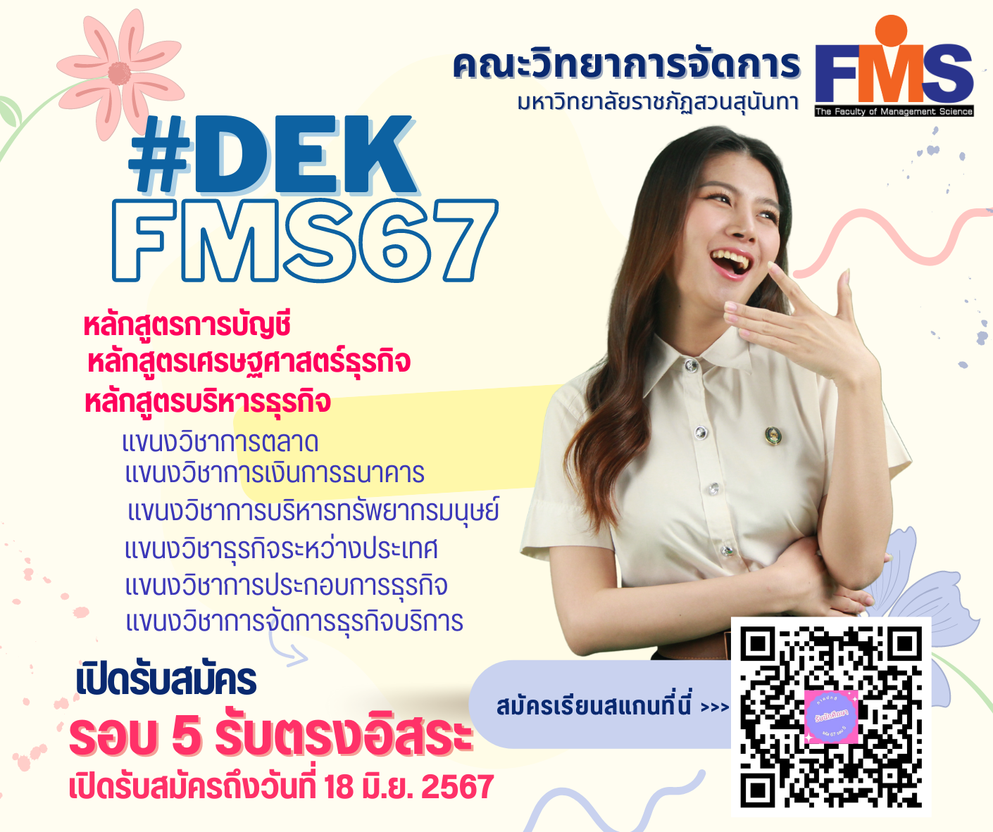 คณะวิทยาการจัดการ มหาวิทยาลัยราชภัฏสวนสุนันทา เปิดรับสมัครนักศึกษาใหม่ ภาคปกติ ระดับปริญญาตรี ประจำปีการศึกษา 2567 (รอบที่ 5 รับตรงอิสระ) ตั้งแต่บัดนี้จนถึงวันที่ 18 มิถุนายน 2567