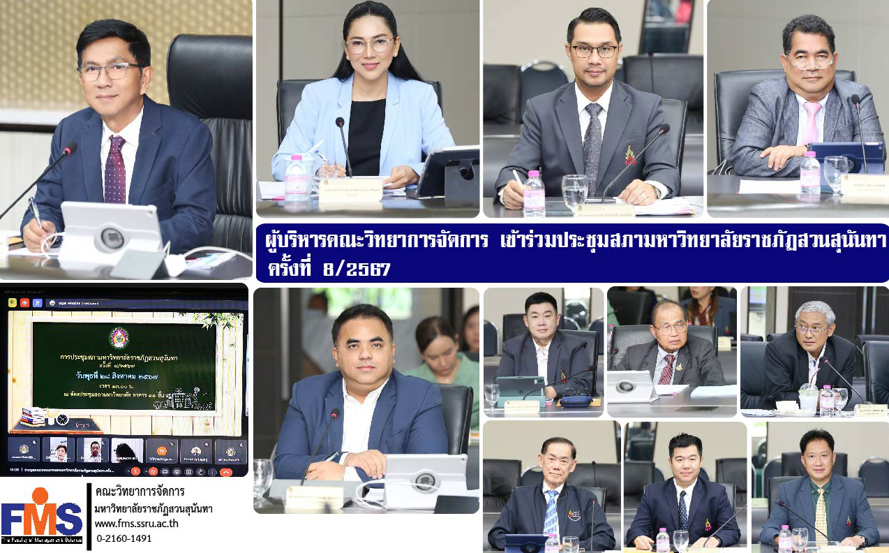 วันที่ 28 สิงหาคม 2567 เวลา 13.00 น. ผู้ช่วยศาสตราจารย์ ดร.สมศักดิ์ คล้ายสังข์ คณบดีคณะวิทยาการจัดการ (กรรมการสภามหาวิทยาลัย ประเภทผู้แทนผู้ดำรงตำแหน่งบริหาร) เข้าร่วมประชุมสภามหาวิทยาลัย ครั้งที่ 8/2567 โดยรองศาสตราจารย์ ดร.ฤๅเดช เกิดวิชัย นายกสภามหาวิทยาลัยราชภัฏสวนสุนันทา เป็นประธานการประชุม พร้อมด้วยรองศาสตราจารย์ ดร.ชุติกาญจน์ ศรีวิบูลย์ อธิการบดีมหาวิทยาลัยราชภัฏสวนสุนันทา โดยมีคณะกรรมการสภามหาวิทยาลัยเข้าร่วมประชุม เพื่อพิจารณาให้ความเห็นชอบและเสนอแนะประเด็นพิจารณาในวาระต่างๆ เพื่อการบริหารและขับเคลื่อนมหาวิทยาลัย ณ ห้องประชุมสภามหาวิทยาลัย อาคาร 31 ชั้น 5 พร้อมกับการประชุมในรูปแบบออนไลน์ (Google Meet)