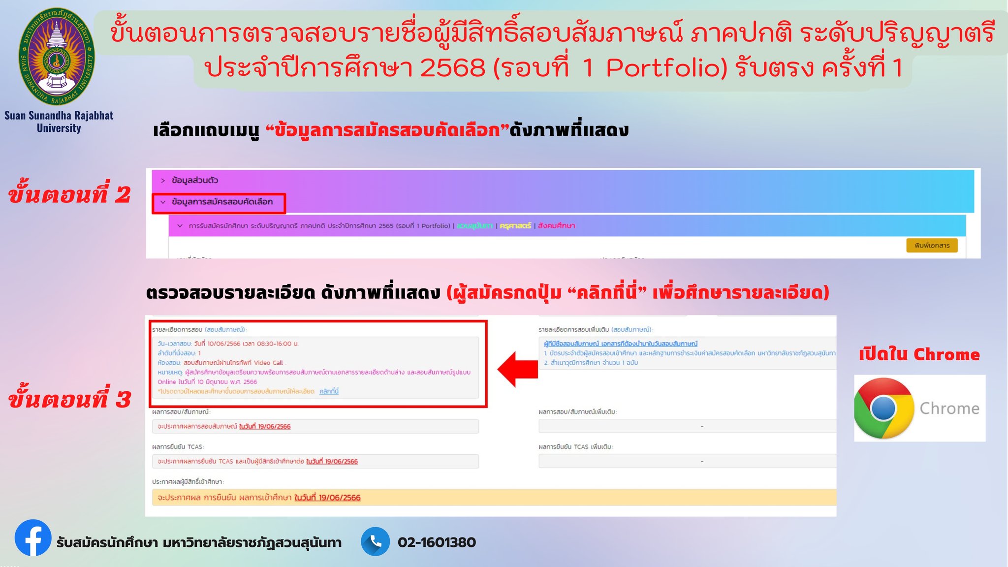 มหาวิทยาลัยราชภัฏสวนสุนันทา ประกาศรายชื่อผู้มีสิทธิ์สอบสัมภาษณ์ ภาคปกติ ระดับปริญญาตรี ประจำปีการศึกษา 2568 (รอบที่ 1 Portfolio) รับตรง ครั้งที่ 1 สามารถตรวจสอบรายชื่อได้ที่เว็บไซต์ https://admission.ssru.ac.th/login