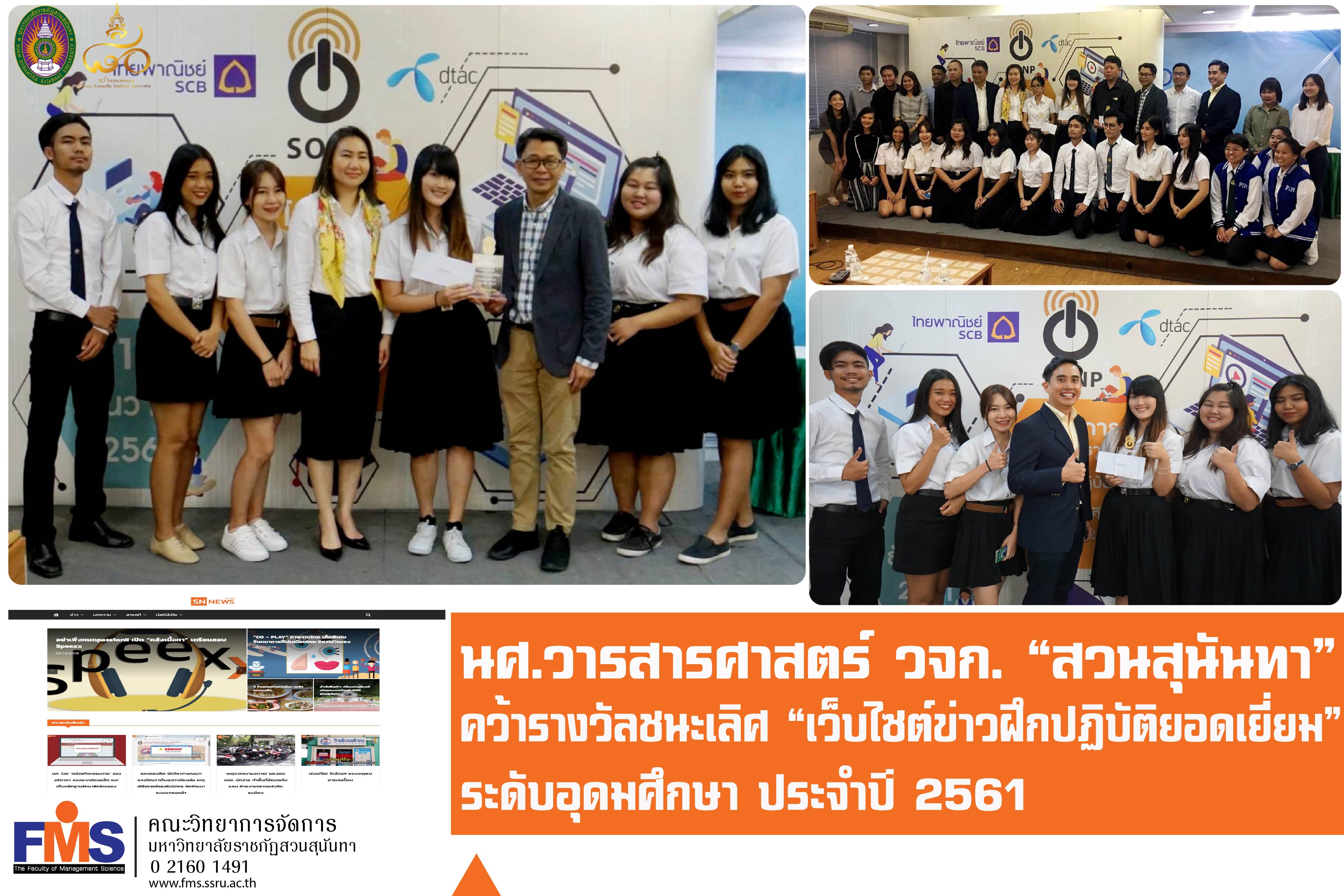 นักศึกษาแขนงวิชาวารสารศาสตร์ คณะวิทยาการจัดการ มหาวิทยาลัยราชภัฏสวนสุนันทา คว้ารางวัลชนะเลิศจากการประกวดเว็บไซต์ข่าวฝึกปฏิบัติยอดเยี่ยม” ระดับอุดมศึกษา ประจำปี 2561