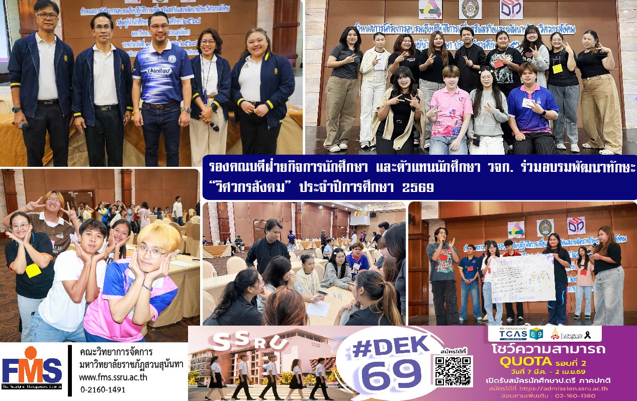 เมื่อวันที่ 17–20 มีนาคม 2569 ผู้ช่วยศาสตราจารย์ ดร.พงศวีร์ สุภานนท์ รองคณบดีฝ่ายกิจการนักศึกษา คณะวิทยาการจัดการ มหาวิทยาลัยราชภัฏสวนสุนันทา พร้อมด้วยนายสมภพ บุญคุ้ม เจ้าหน้าที่บริหารงานทั่วไป ฝ่ายกิจการนักศึกษาและศิลปวัฒนธรรม ได้นำทีมนักศึกษาสโมสรนักศึกษา เข้าร่วมโครงการอบรมเชิงปฏิบัติการเพื่อเสริมสร้างและพัฒนาทักษะ “วิศวกรสังคม” กลุ่มผู้นำนักศึกษา ประจำปีการศึกษา 2569 โดยได้รับเกียรติจากผู้ช่วยศาสตราจารย์ ดร.สมศักดิ์ คล้ายสังข์ รองอธิการบดีฝ่ายกิจการนักศึกษา มหาวิทยาลัยราชภัฏสวนสุนันทา เป็นประธานในพิธีเปิดโครงการ