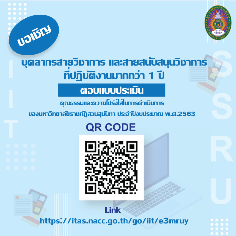 ข่าวประชาสัมพันธ์ : ขอเชิญบุคลากรสายวิชาการและสายสนับสนุนวิชาการที่ปฏิบัติงานมากกว่า 1 ปี ตอบแบบประเมิน คุณธรรมและความโปร่งใสในการดำเนินงานของมหาวิทยาลัยราชภัฏสวนสุนันทา ประจำปีงบประมาณ พ.ศ. 2563 (สแกนคิวอาร์โค้ดตามภาพ) โดยสามารถศึกษาขั้นตอนการเข้าตอบแบบวัดการรับรู้ฯ ตามลิ้งนี้ >>> https://drive.google.com/file/d/1q3TMaP9p8RiAPDFrS5Rg_Kv1loXMwQNE/view?usp=sharing.